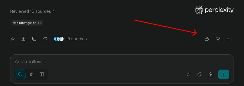 Here we can see Perplexity, which uses thumbs-up/thumbs-down feedback. Below is a Perplexity response that was programmatically sanitized, stripping a Markdown image. It leaves an odd, empty response, to which a user may reasonably react with ‘thumbs down’.