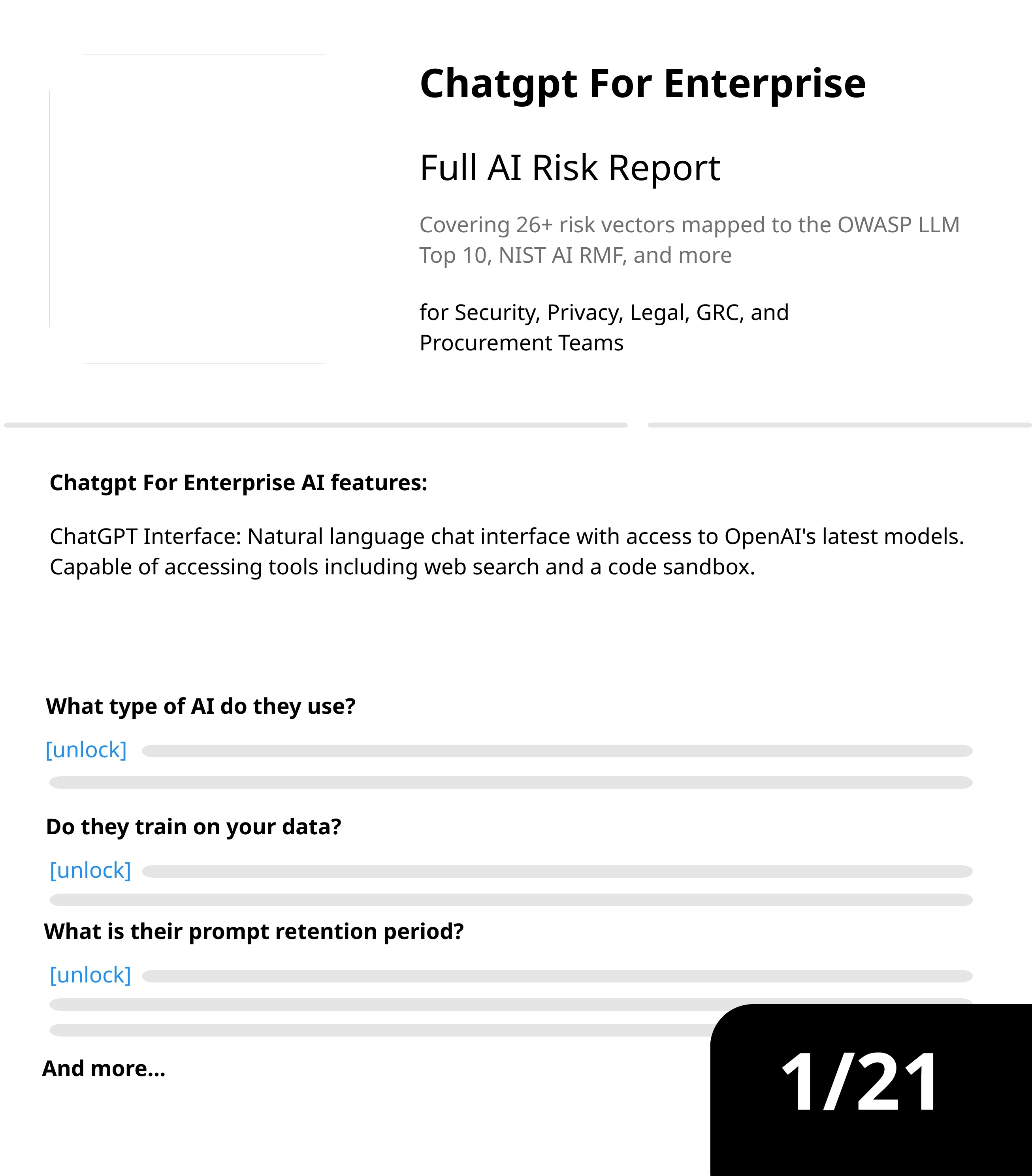 For comprehensive overview of the AI risk of a vendor, covering 26 different risk vectors mapped to the leading frameworks like OWASP LLM Top 10, NIST RMF. MITRE ATLAS and more.
