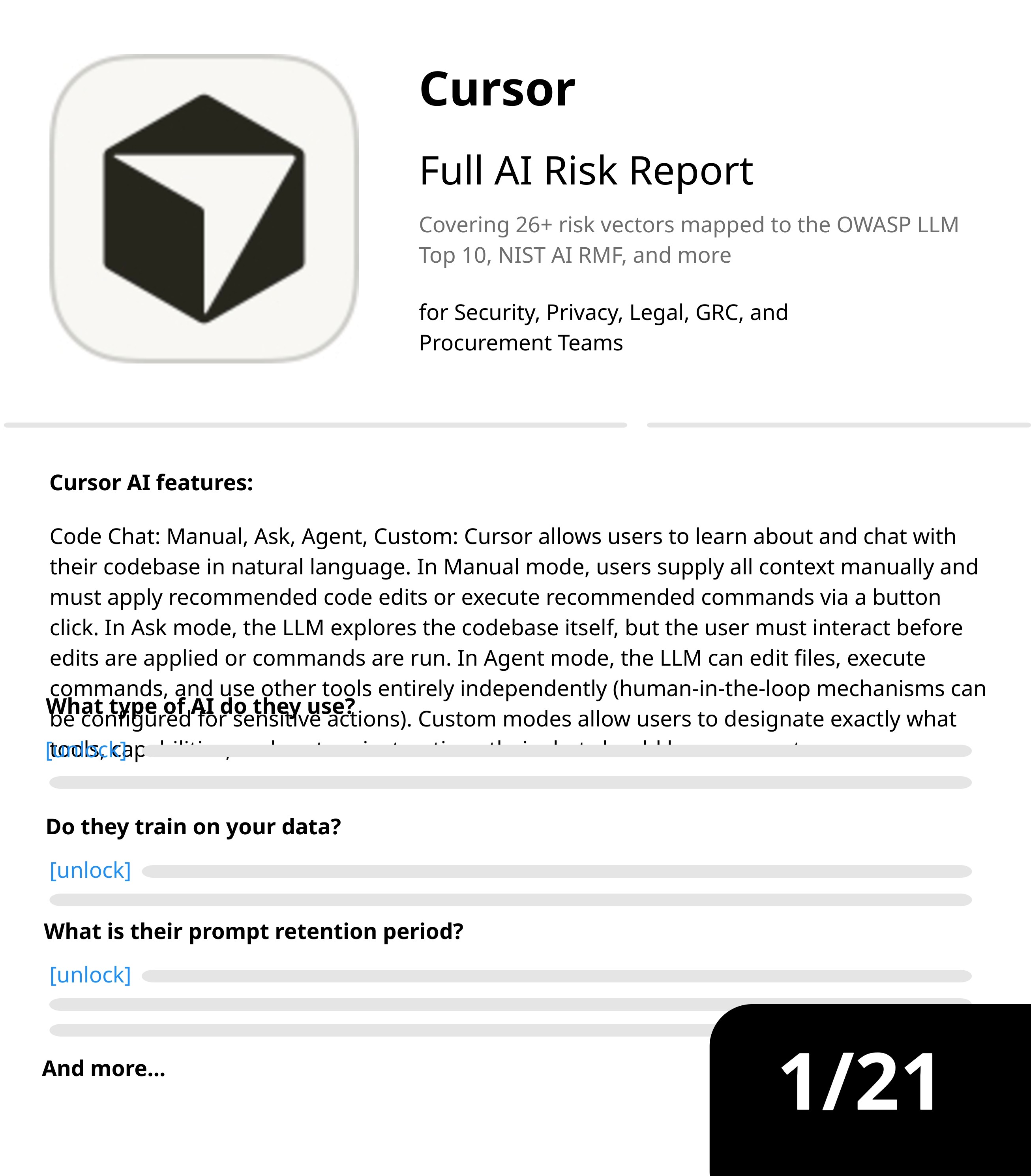 For comprehensive overview of the AI risk of a vendor, covering 26 different risk vectors mapped to the leading frameworks like OWASP LLM Top 10, NIST RMF. MITRE ATLAS and more.