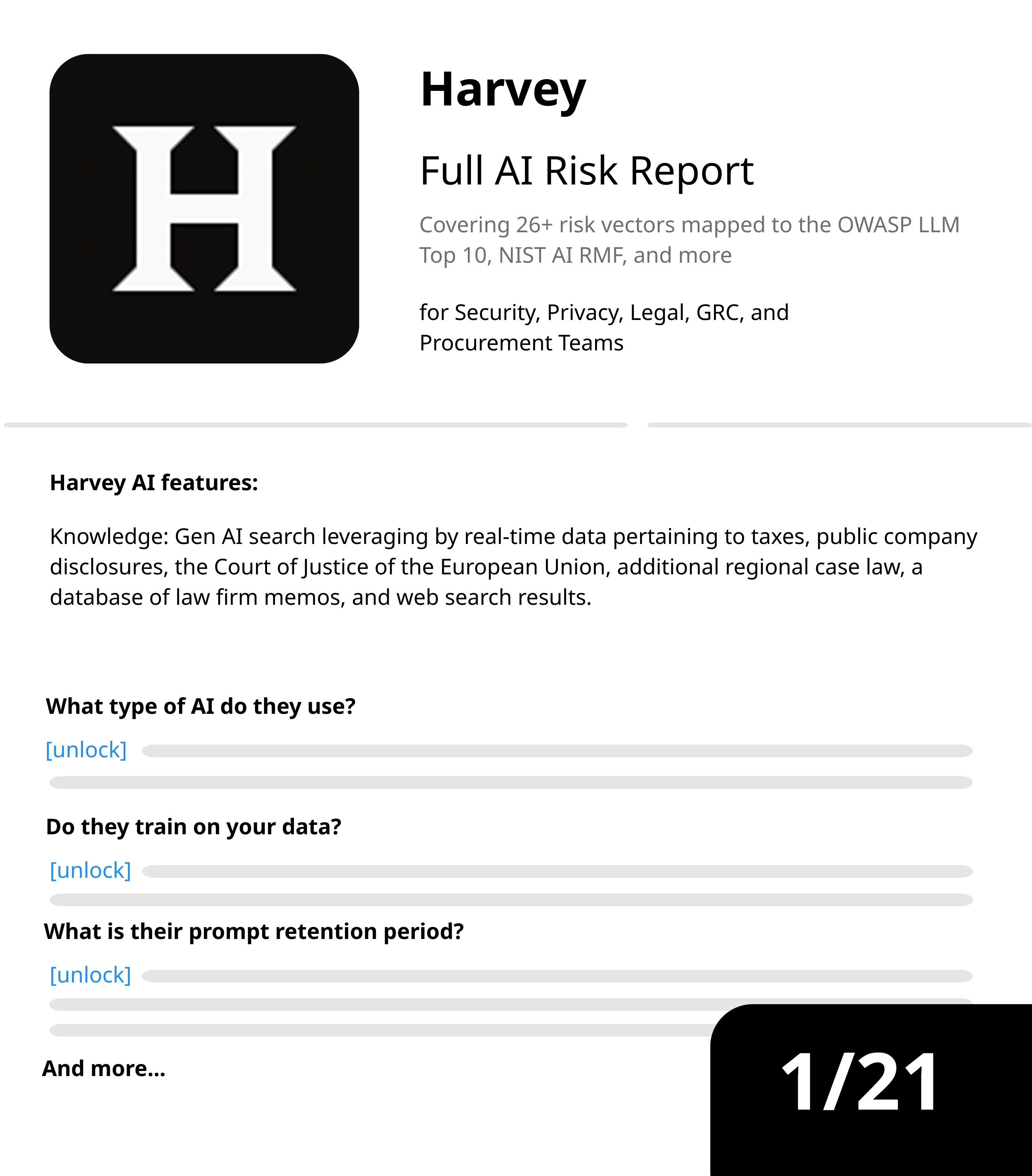 For comprehensive overview of the AI risk of a vendor, covering 26 different risk vectors mapped to the leading frameworks like OWASP LLM Top 10, NIST RMF. MITRE ATLAS and more.